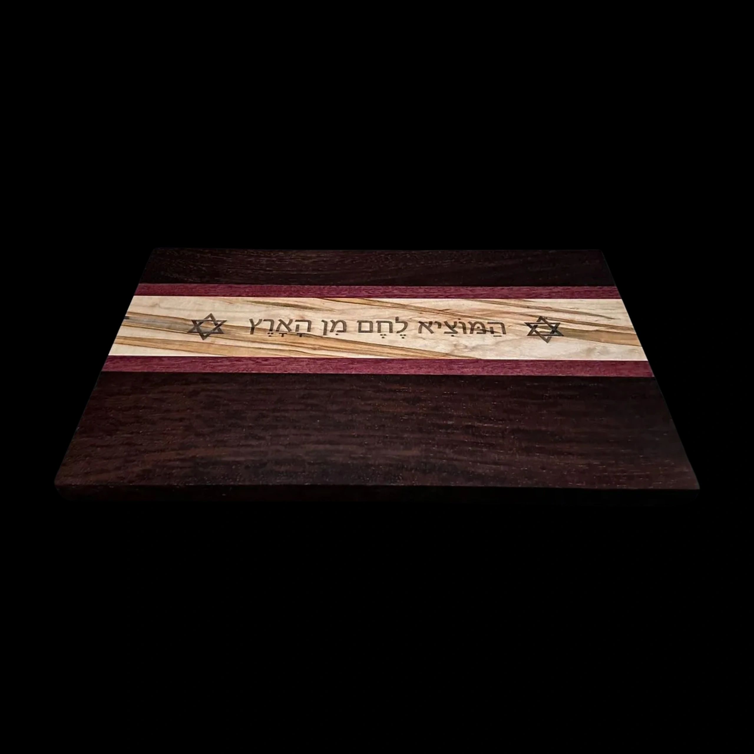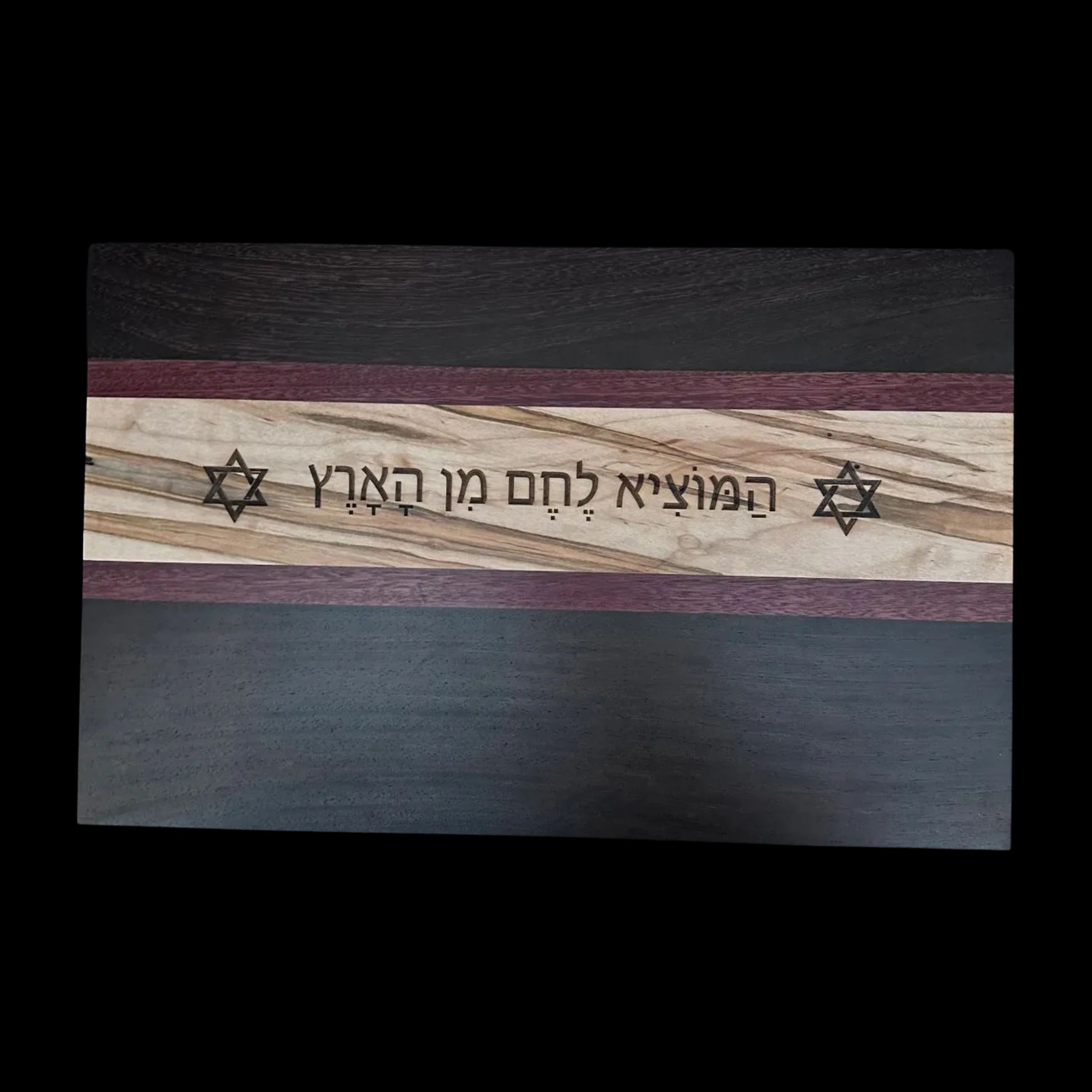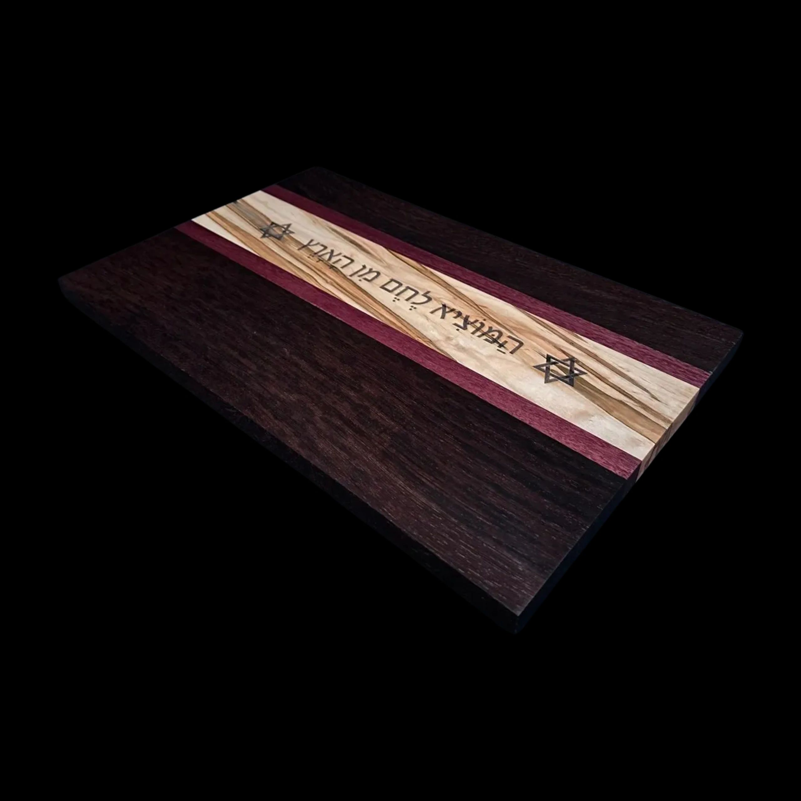 This exquisitely bespoke designed challah cutting board and serving tray is designed to be both functionally effective and aesthetically stunning. Crafted from premium; Wenge, Spalted Maple and Purple Heart wood, featuring a timeless design that complements any Shabbat table or kitchen.