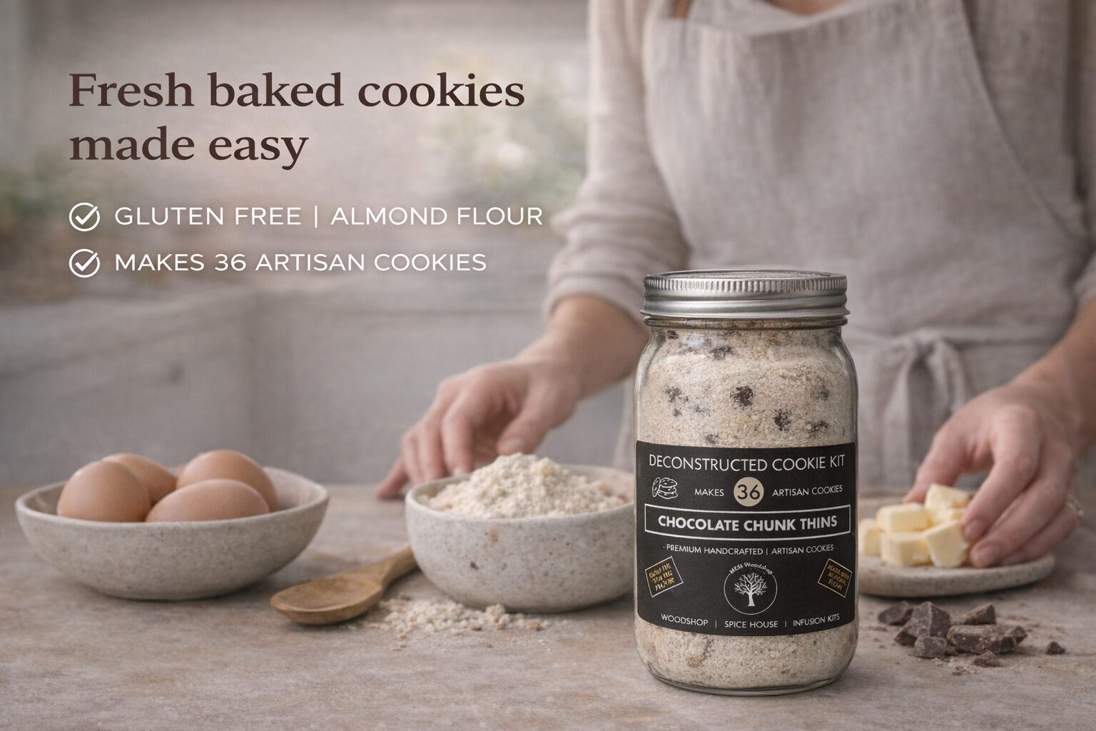 • CHOCOLATE CHUNK THINS GLUTEN FREE COOKIES: Each cookie jar makes up to 36 artesian almond cookies.
