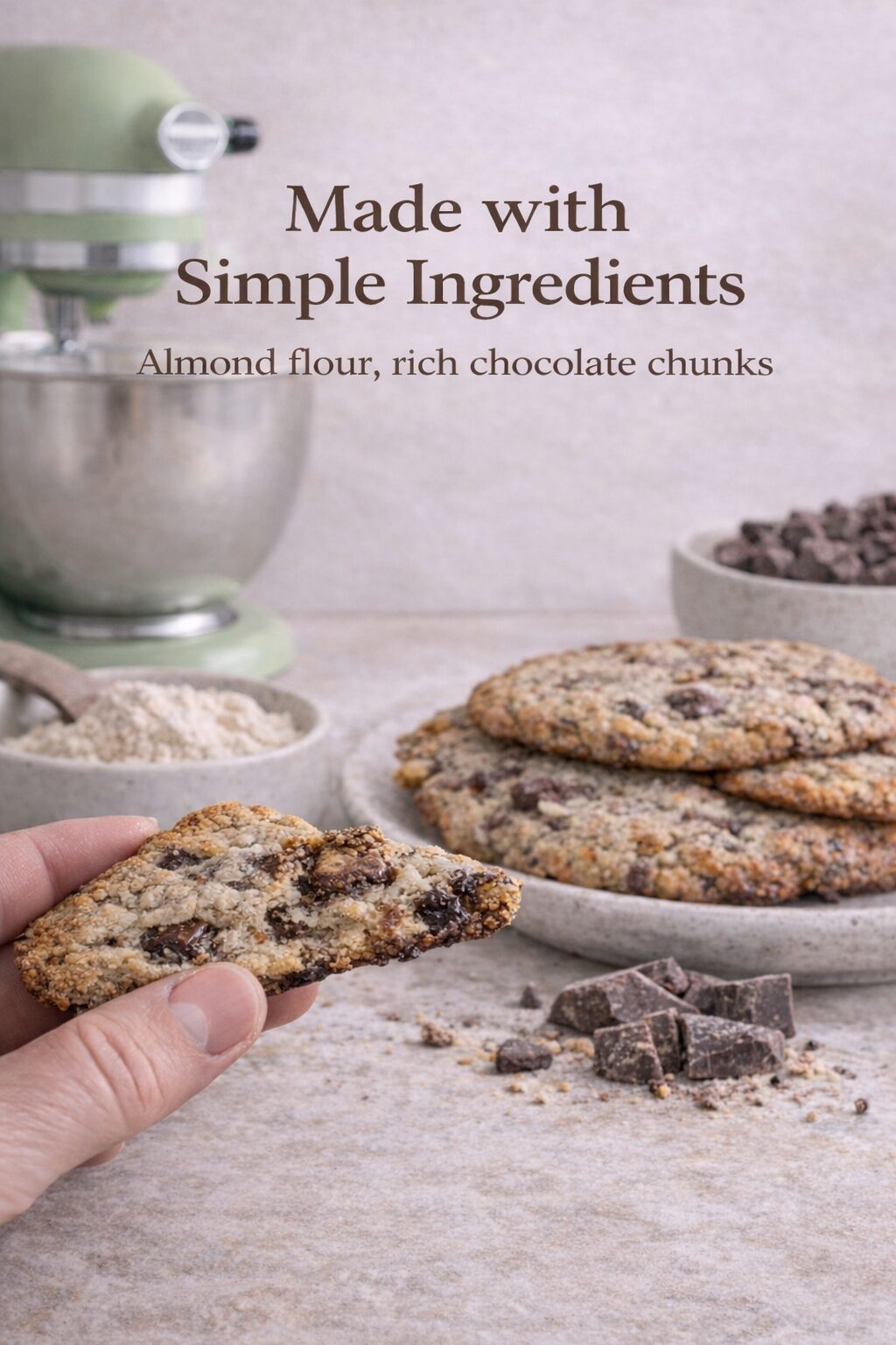 We pack our gluten-free cookie mix with chocolate, brown sugar, and maple syrup, all made with unblanched almond flour. These cookies spread as they bake, stay gooey in the center, and develop crisp, crunchy edges.