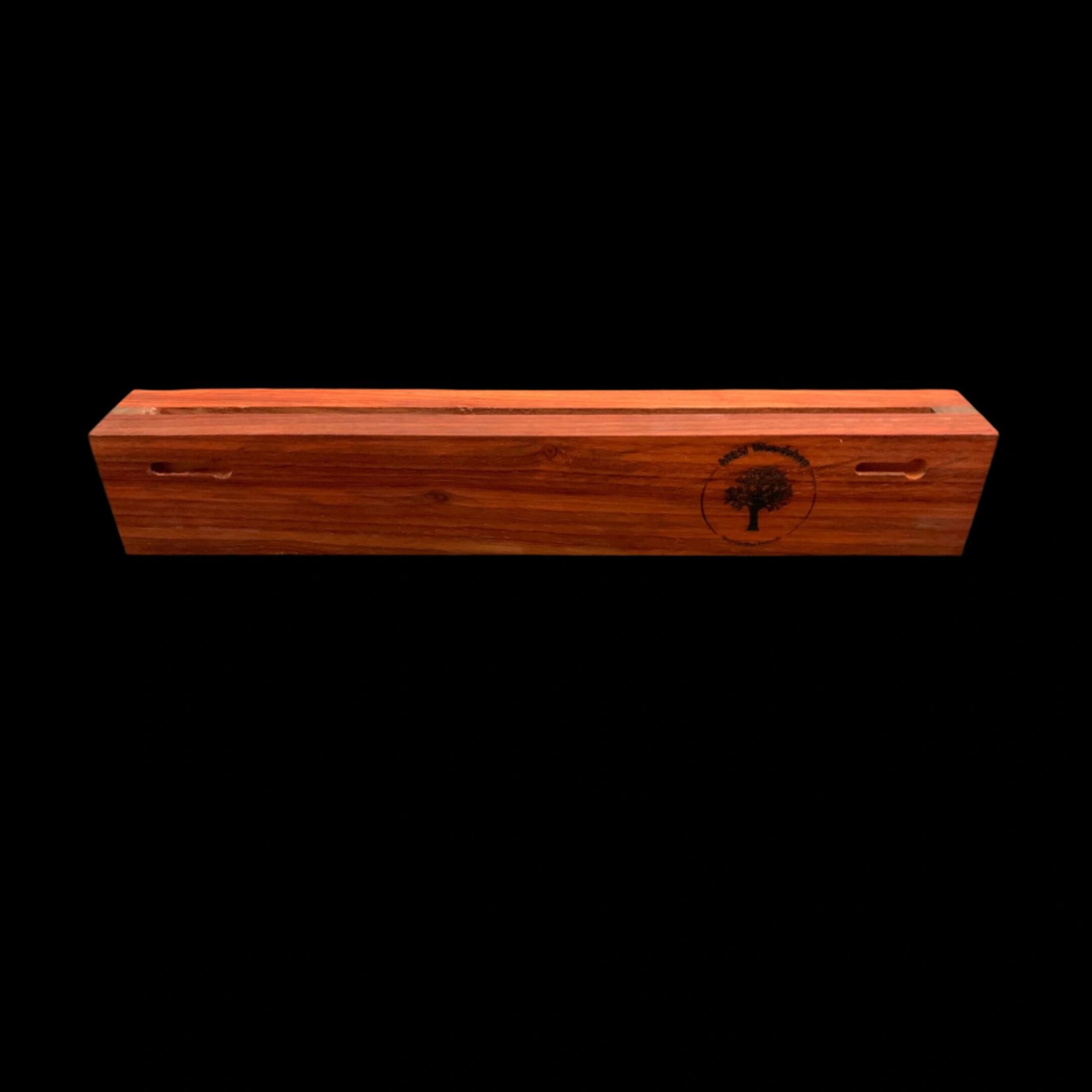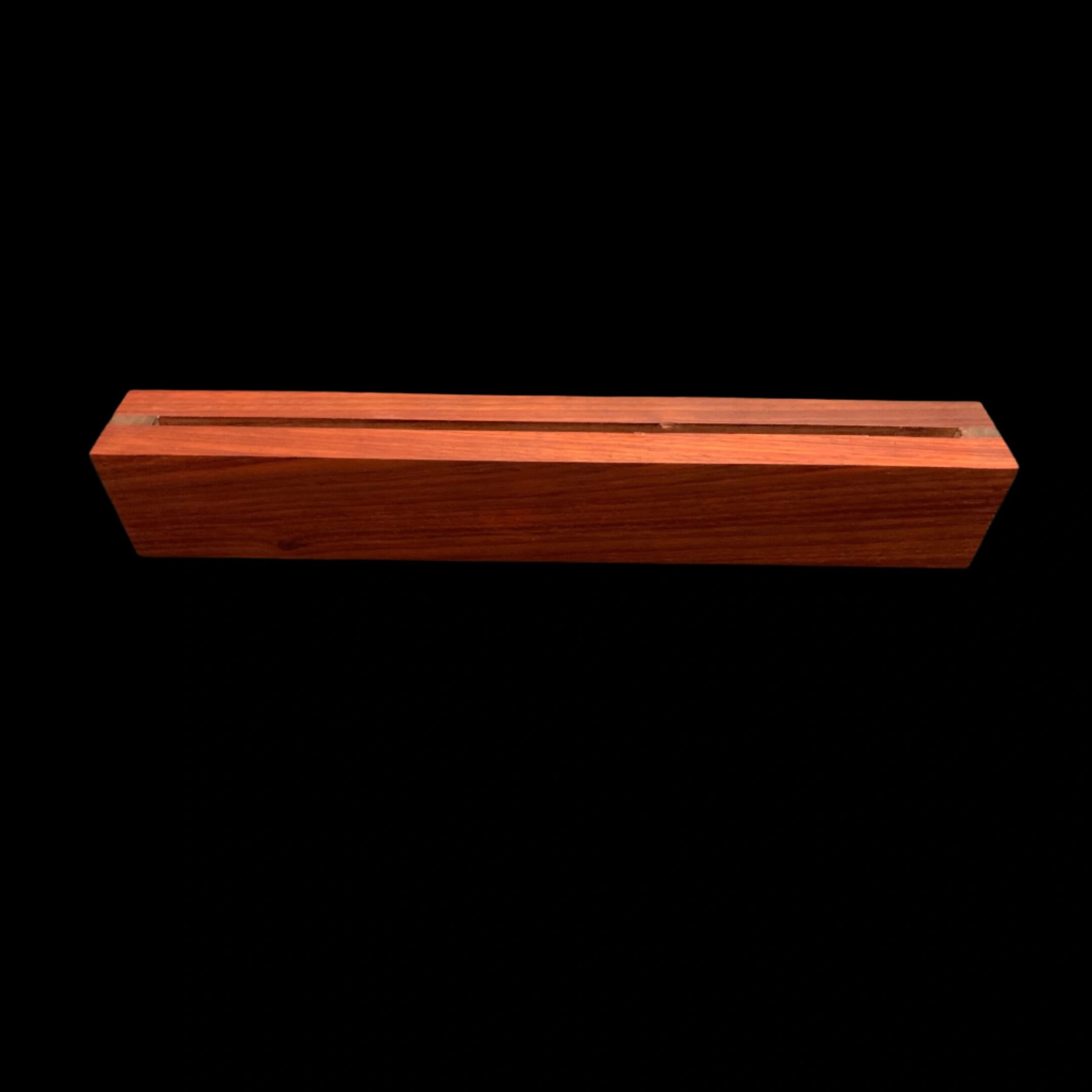 This slotted, wall mounted, knife rack is truly original. Made from Padauk, a vibrant colorful wood, you will now have a place to store your knives safely and securely. Simply mount this knife rack on a wall and slide your knives into the slot on the top.
