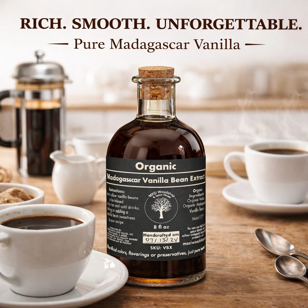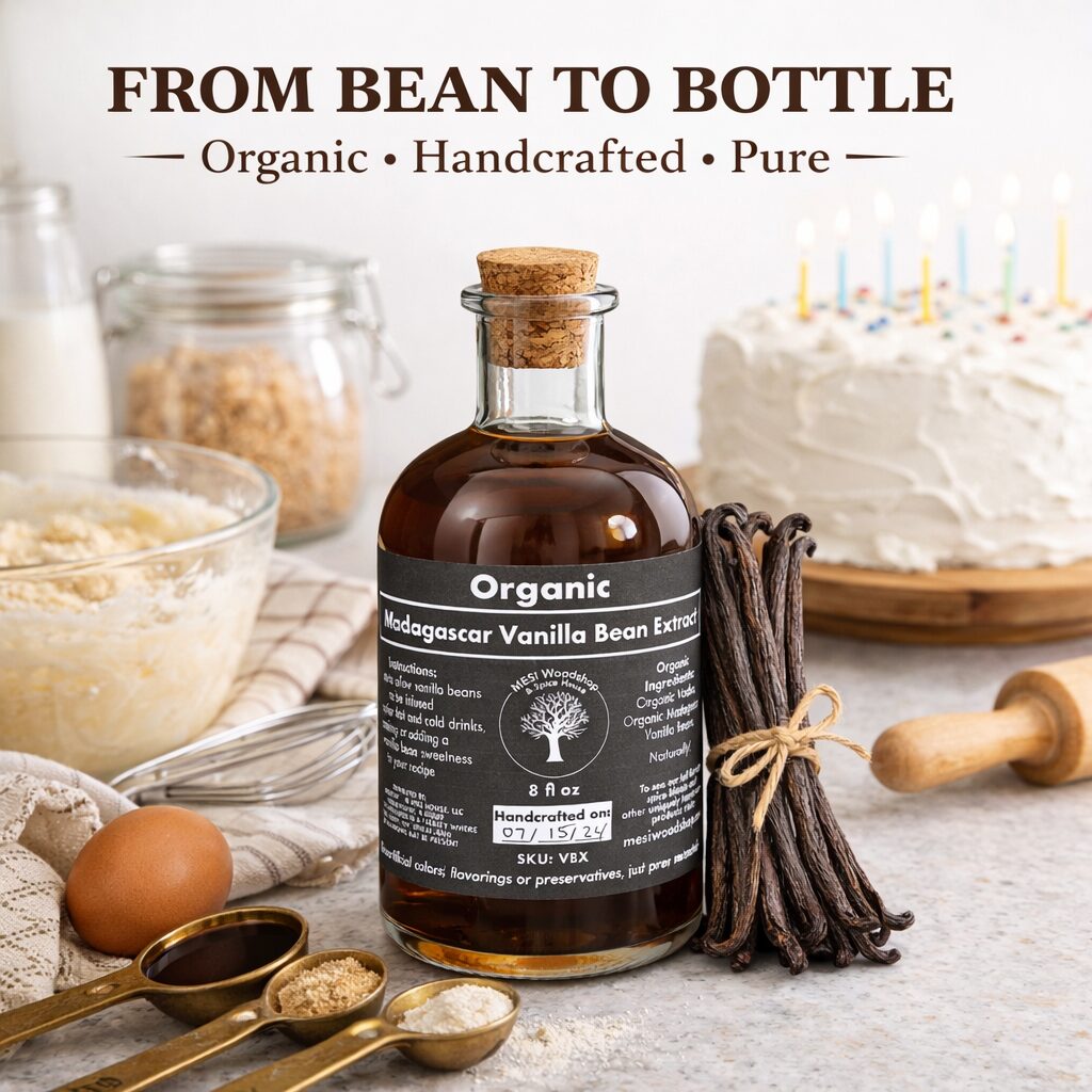 Elevate your baking and cooking with MESI Woodshop & Spice House’s Organic Madagascar Vanilla Bean Extract.