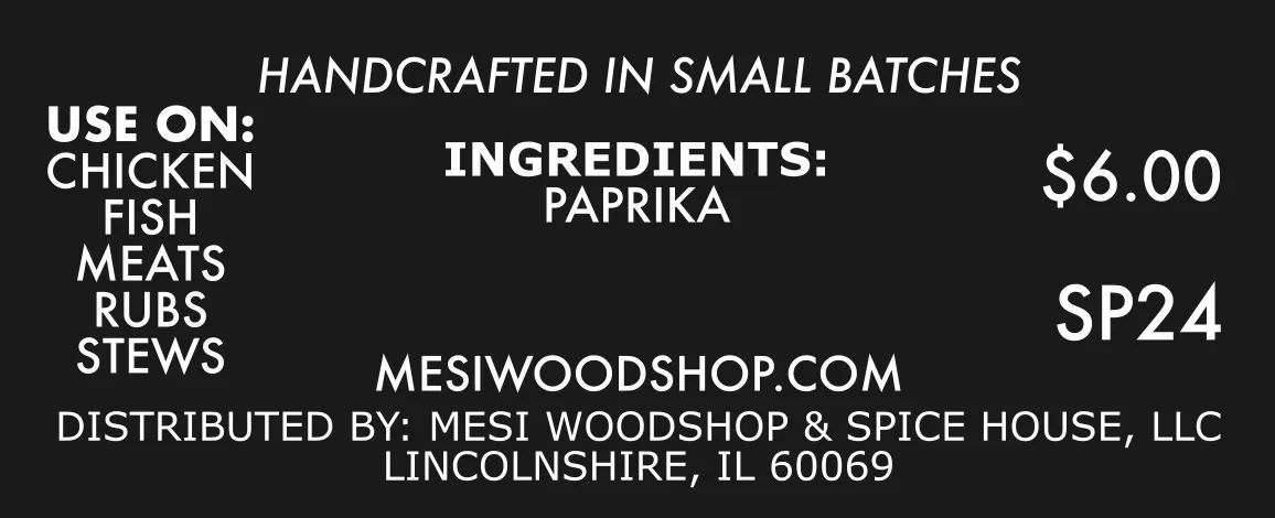 At MESI Woodshop and Spice House, we pride ourselves on using only natural, wildcrafted spices, herbs, and botanicals. Crafted in small batches, our smoked paprika is carefully sourced for superior quality and flavor you can trust.