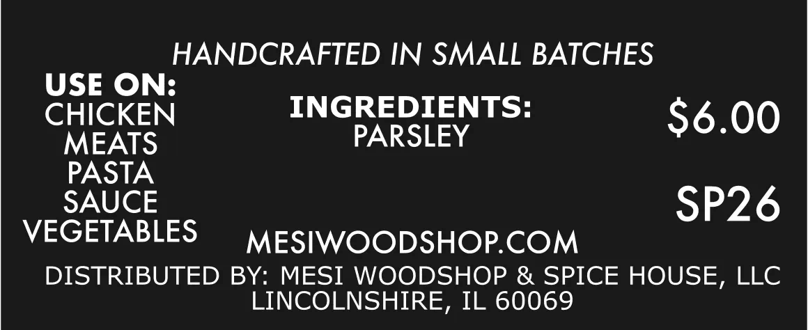 At MESI Woodshop and Spice House, we are committed to using only natural, wildcrafted spices, herbs, and botanicals. Our parsley flakes are handcrafted in small batches with care and precision, ensuring exceptional quality and flavor in every jar.