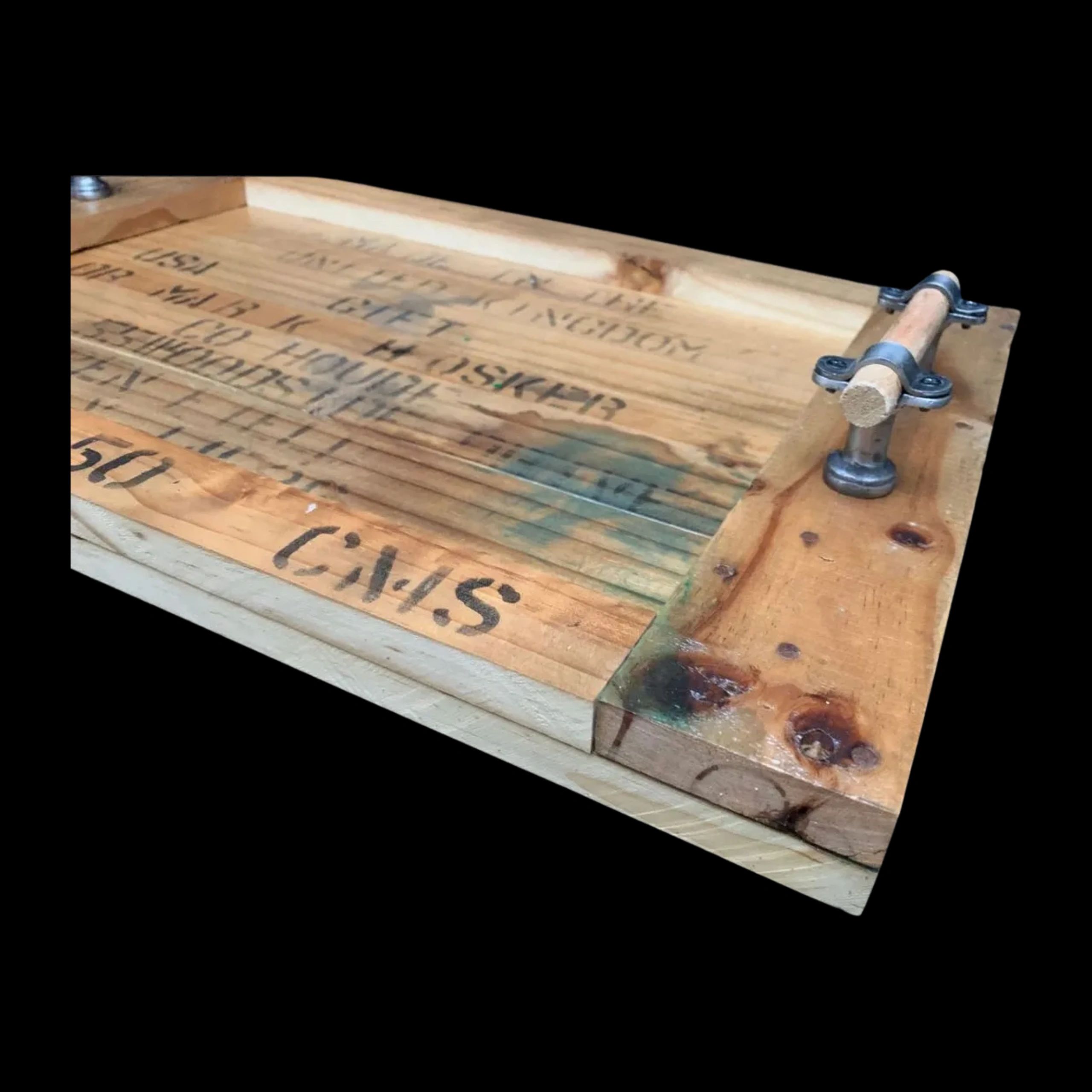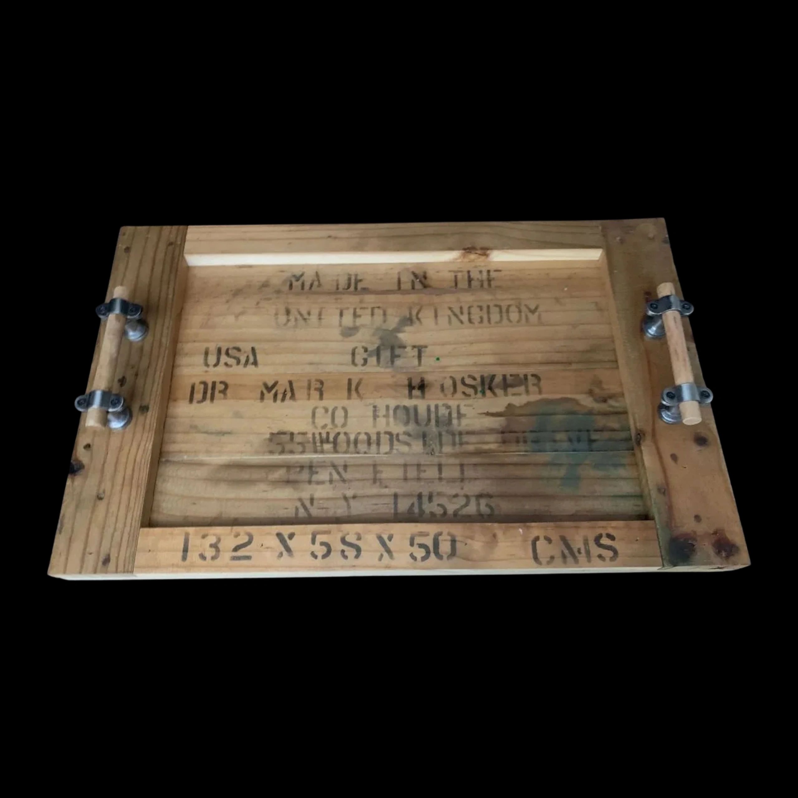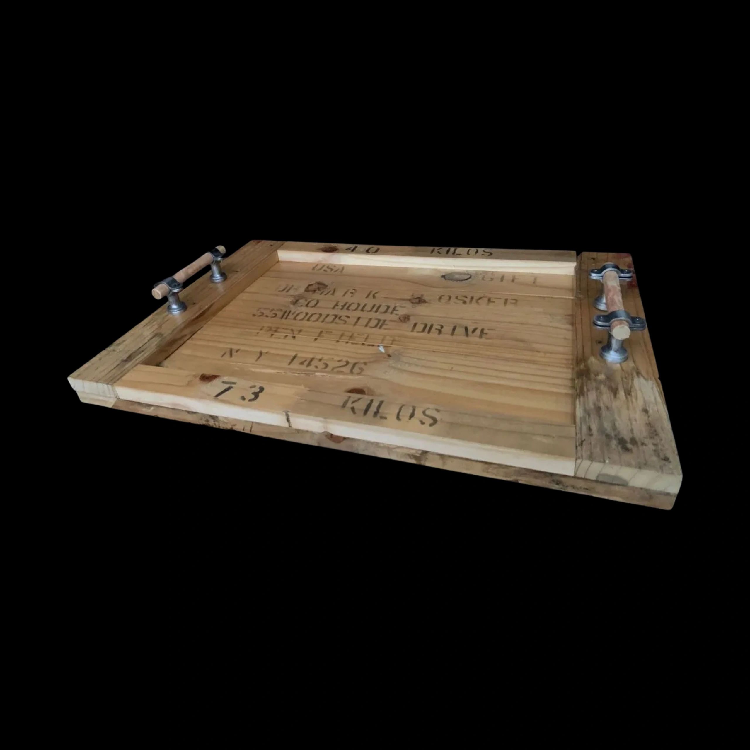 This hardwood serving tray is hand crafted to meticulous detail and one to be proud to use. This serving tray was hand crafted from a vintage shipping crate over 50 years old. Attached to the top are 2 classic dowel style handles which match the original shipping container wood. Also attached on the bottom are 4 non-slip rubber feet pads attached to the base for added functionality.