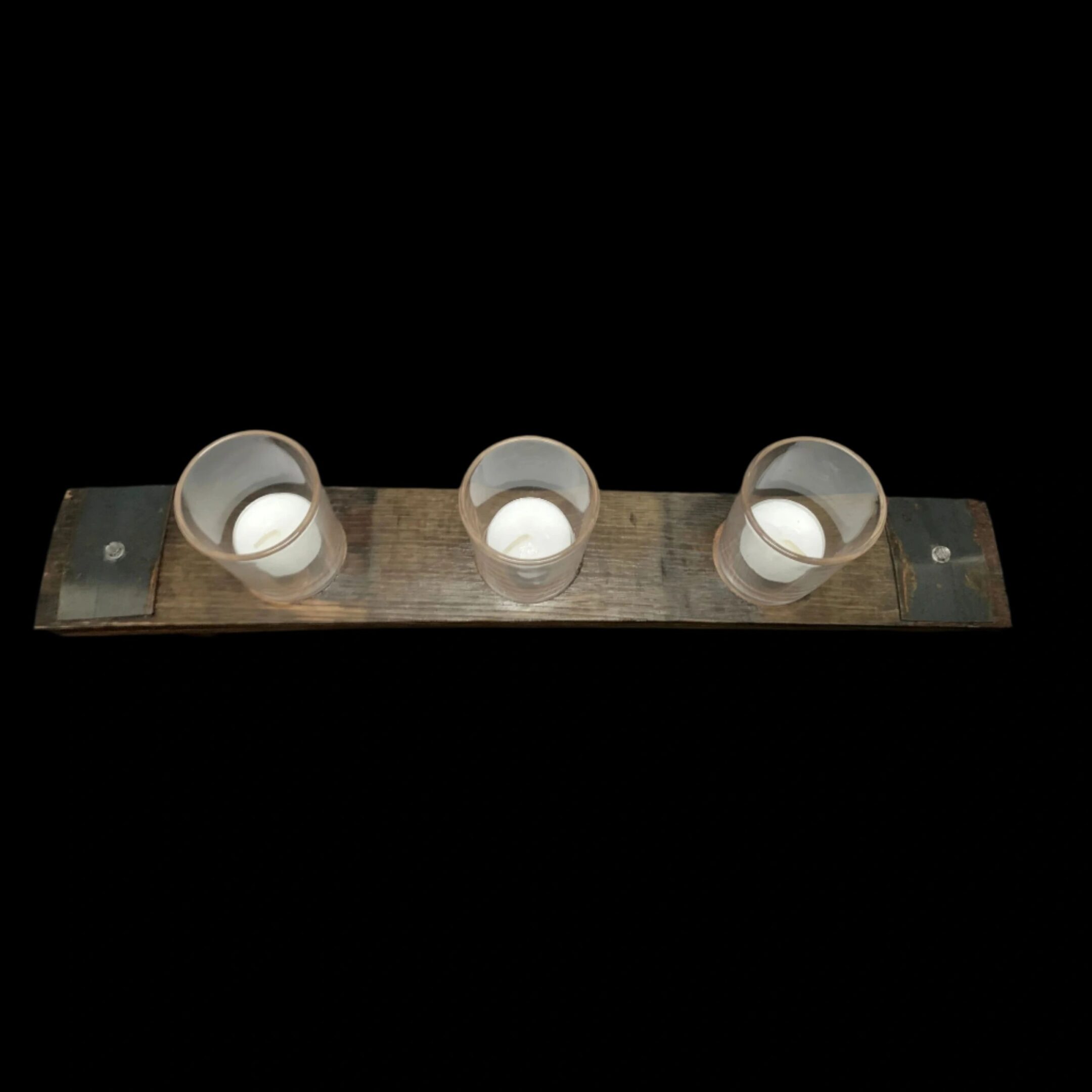 This one of a kind salvaged whiskey barrel tealight candle stave will add character to any social gathering. This centerpiece is handcrafted from a reclaimed whiskey barrel and its reclaimed metal barrel band.