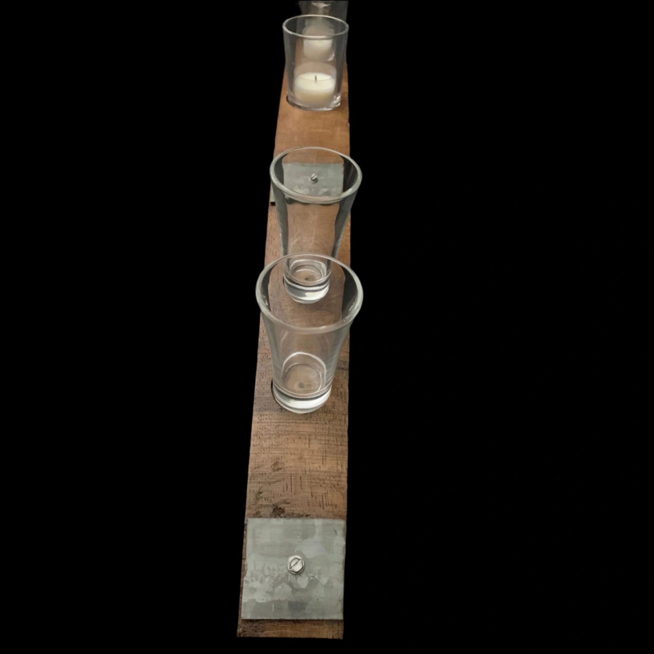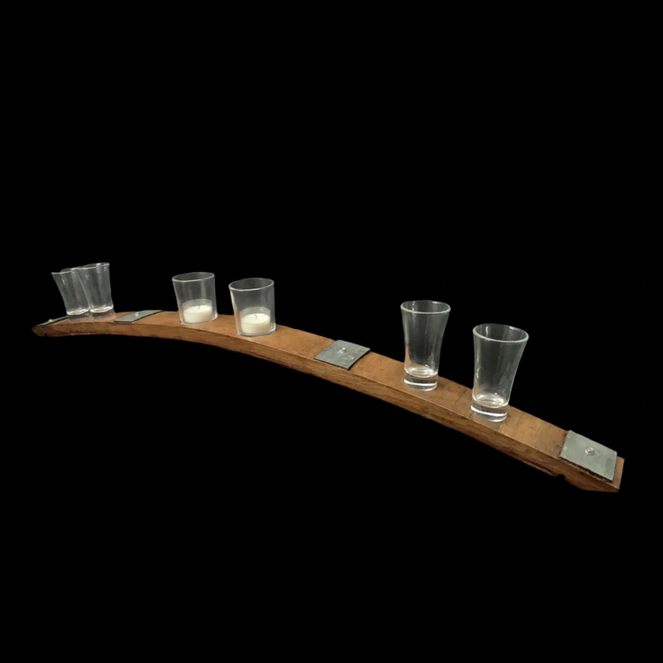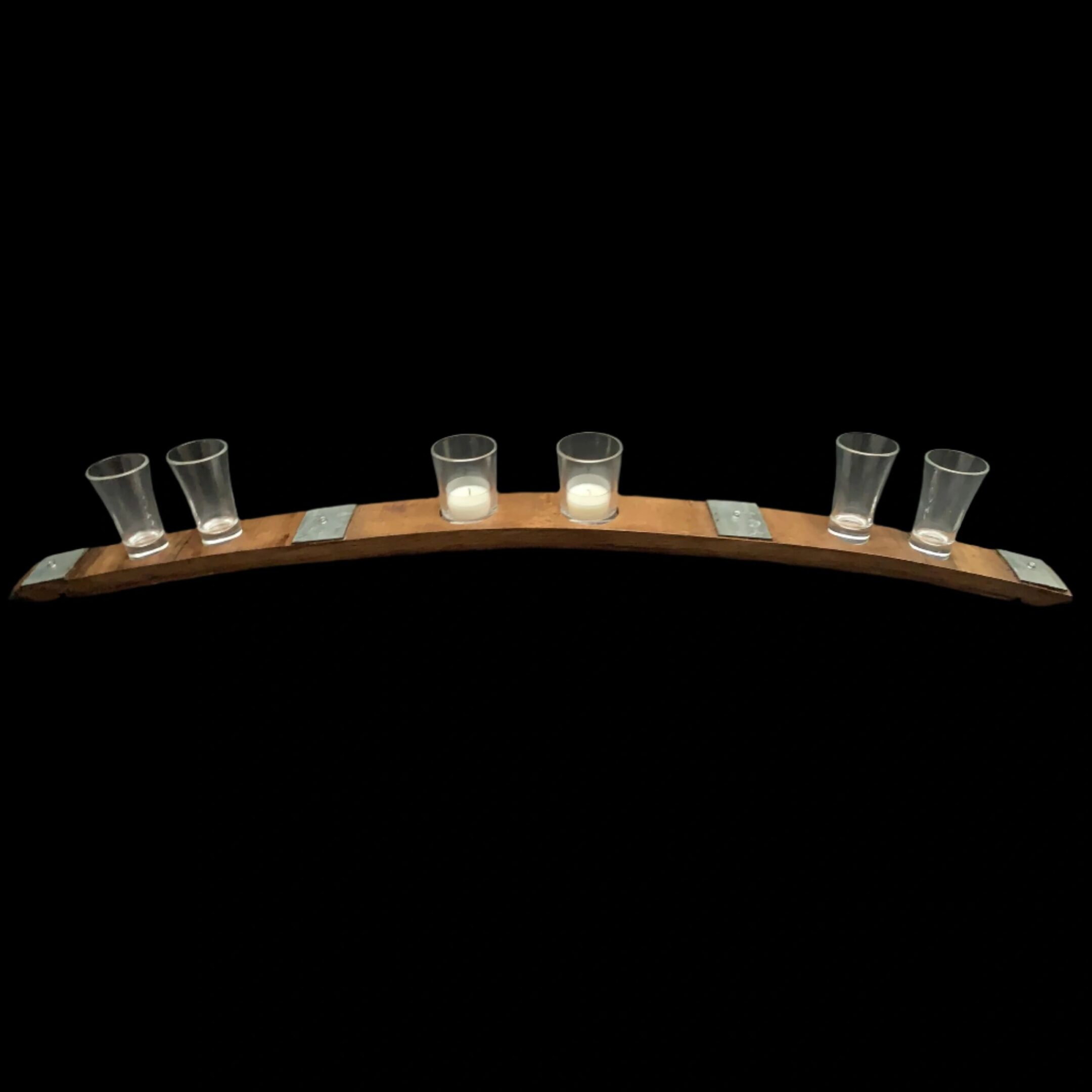 This barrel stave has places for 4 glass shot glasses and 2 tealight candles