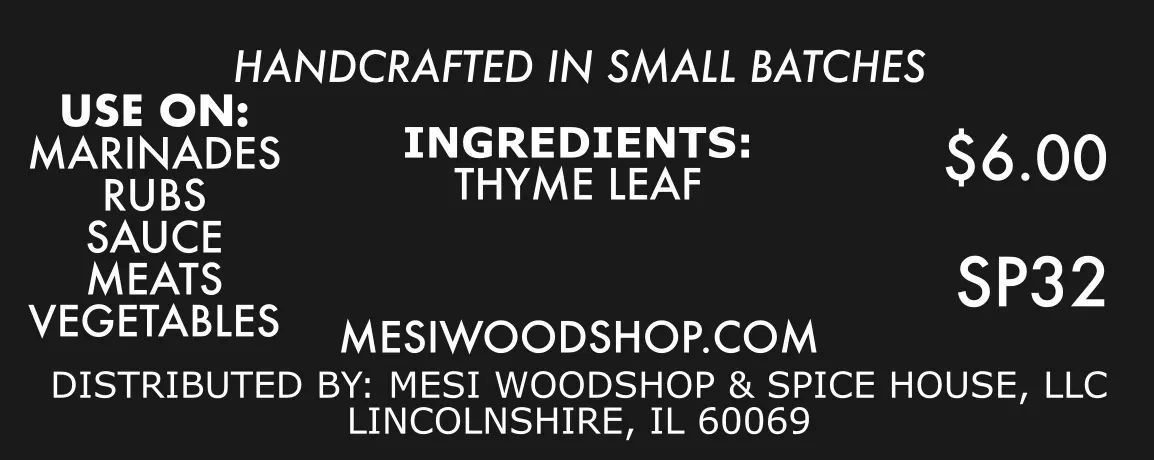 At MESI Woodshop and Spice House, we are committed to using only natural, wildcrafted spices, herbs, and botanicals. Our thyme leaf is handcrafted in small batches with care and precision, ensuring exceptional quality and flavor in every jar.